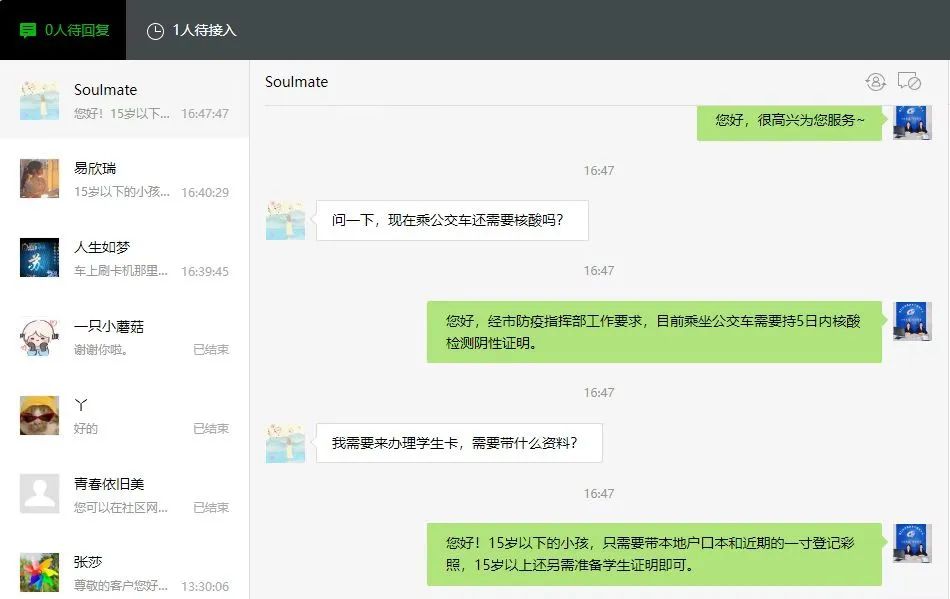 8月份升級開通網絡人工客服,市民通過荊門公交微信公眾號,與人工客服1號、2號坐席進行溝通,建立起集咨詢、尋物、建議、投訴等一體化的綜合在線服務。
