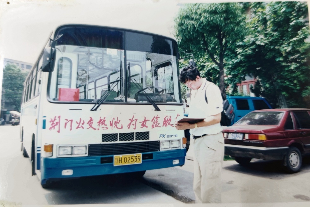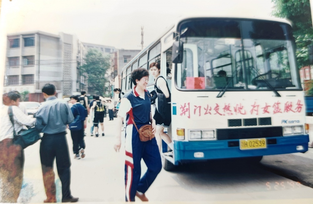 ▲1999年5月25日,沈陽(yáng)電梯隊(duì)隊(duì)員、教練乘坐公交出行。公交車頭還掛有“荊門公交熱忱為女籃服務(wù)”橫幅。