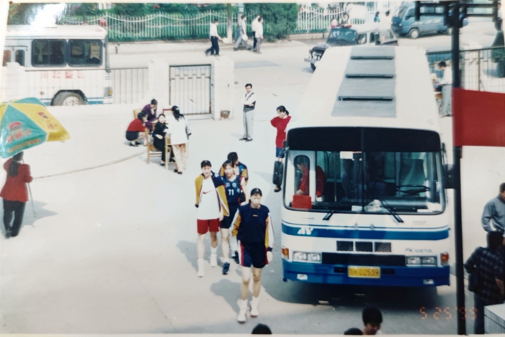▲1999年5月25日,到達(dá)荊門石化體育館。遠(yuǎn)處看女藍(lán)隊(duì)員走過(guò)公交車,個(gè)頭真的高。