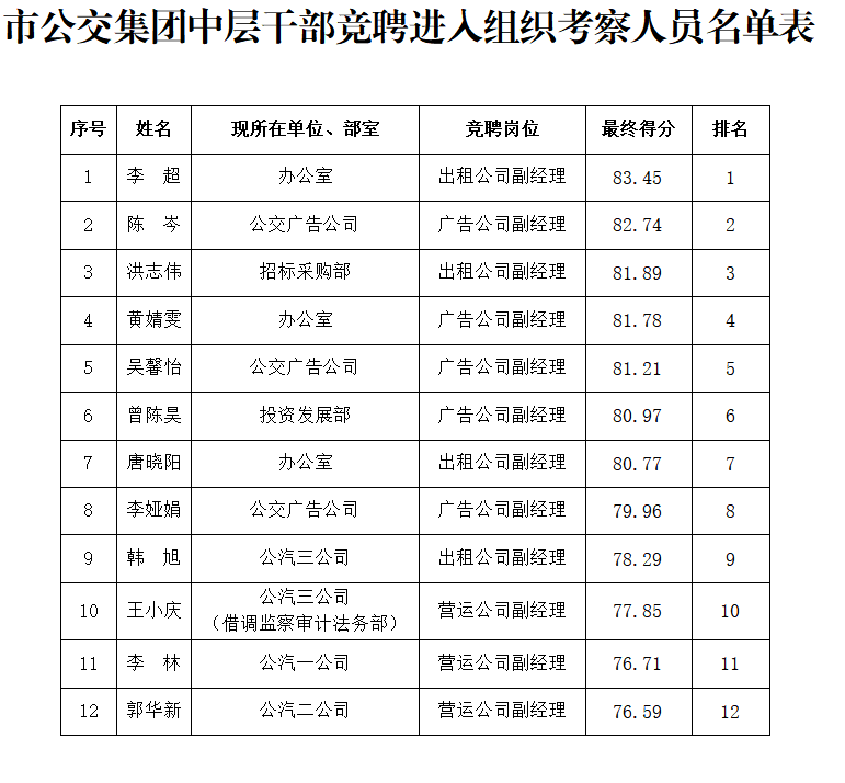 根據(jù)市公交集團(tuán)中層干部競(jìng)聘工作要求,共有12名競(jìng)聘者(最終得分前12名)進(jìn)入組織考察環(huán)節(jié),現(xiàn)將人員名單公示如下(見(jiàn)附件)。