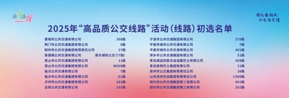 近日交通運輸部2025年“我的公交我的城”主題宣傳活動(寶雞站)相關初選名單公布8路巾幗示范線入選2025年“高品質公交線路”活動初選名單。