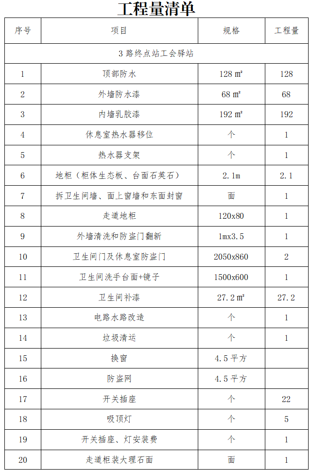 工程內(nèi)容:3路、8路終點站及出租車駕駛員休息驛站,統(tǒng)一規(guī)劃、整合升級,具體內(nèi)容詳見工程量清單(附件)。